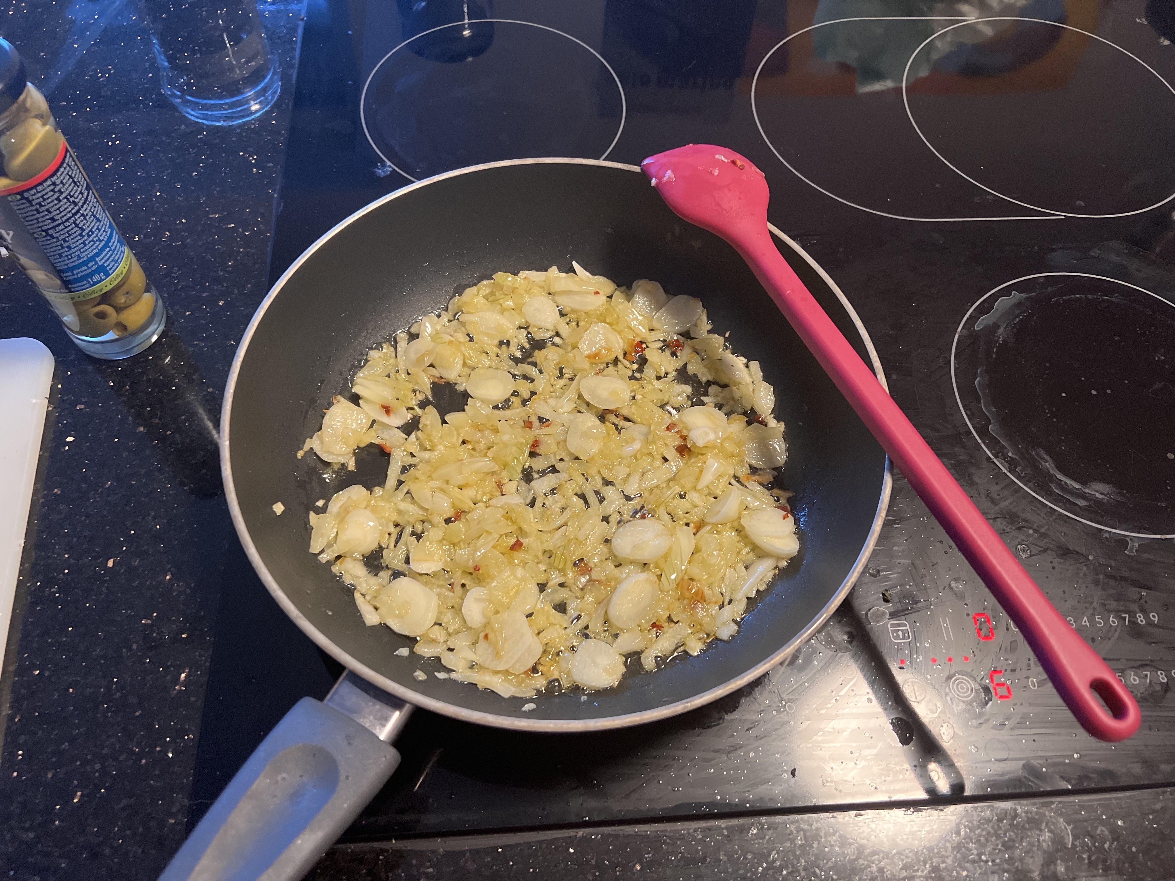 - Pridaj cesnak nakrájaný na plátky a papričky. Nechaj pracovať zopár minút
